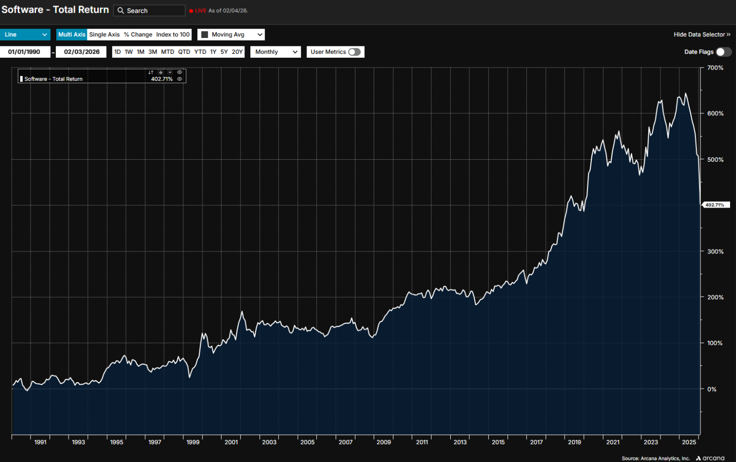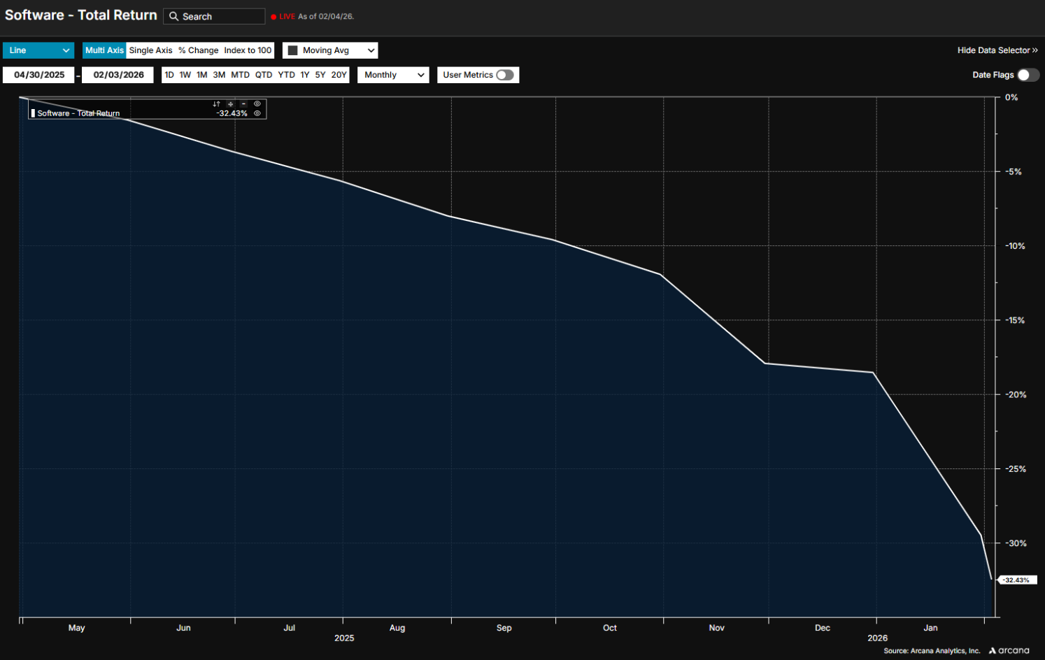 This week’s sell‑off did not mark the beginning of Software’s decline; the Software Industry Factor had been flashing warning signs for months, long before the market took notice.