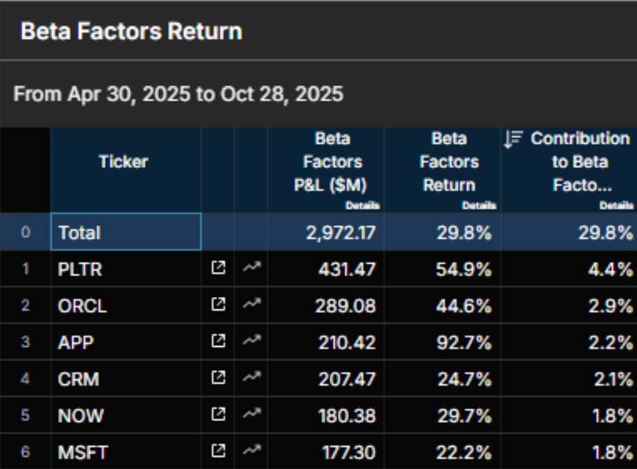 A handful of major players including Palantir (PLTR), Oracle (ORCL), AppLovin (APP), Salesforce (CRM), ServiceNow (NOW), and Microsoft (MSFT)carried the day, accounting for more than half of the Beta Factor’s 29.82% contribution.